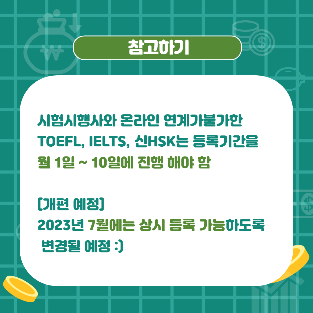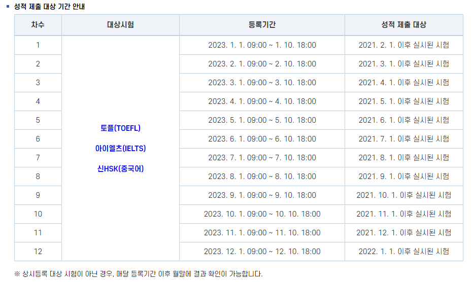 현재 토플, 아이엘츠, 신HSK 어학성적은 온라인 연계가 현재 불가해서 7월 전까지는 지정된 매월 1일에서 10일 사이에 어학성적 사전 등록을 해야 합니다.
