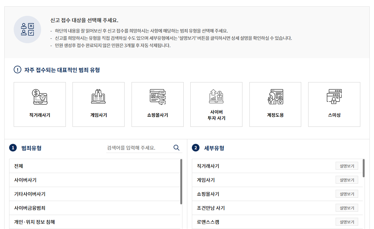 - 신고 유형 선택 → 오프라인 사기 아니라고 누르다 보면 → '사이버사기' 선택할 수 있습니다.