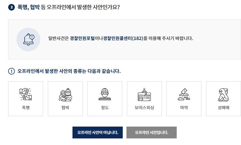 - -> 피해자 신고가 다수 발생된 경우는 온라인 접수 시 방문할 필요 없다고 알럿창이 별도로 뜹니다.
