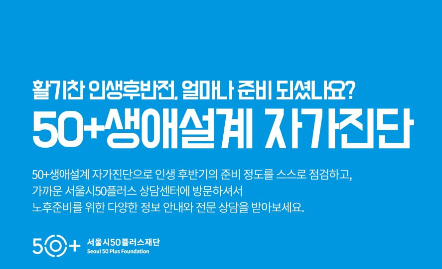서울시 50플러스 재단은 40대 ~ 60대까지 50세 이후 새로운 문화생활과 삶을 계획하는데 도움이 되는 교육서비스를 지원하고 있습니다. 예를 들면 사회공헌 일자리, 창업 교육, 생애설계 상담 및 교육을 제공하면서 노후 준비에 필요한 다양한 정보를 제공하는 시니어 맞춤 플랫폼입니다. 서울시 50 플러스 포털 방문이 처음이라면 생애 설계 자가진단 테스트를 먼저해보는 걸 추천해요!
