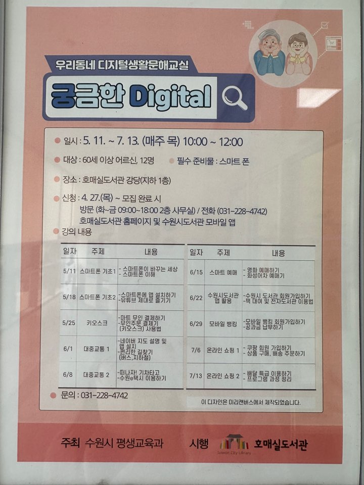 요즘에는 무인점포도 많아지고 코로나 19 이후로 비대면으로 주문하는 게 일상이 됐습니다. 간혹 처음 방문한 매장에서 키오스크로 주문할 때 저도 버벅이는 적이 있어요. 그럴 때 아 나도 이런데 어른들은 진짜 어려우시겠다라는 생각이 들더라고요. 이번에 수원시에서 어르신 대상 스마트폰 교육생을 모집 중인 곳이 보여서 소식 전해드립니다. 무료 스마트폰 교육과 유료 스마트폰 교육인 경우도 있어요. 일단 60세 이상 어르신 대상 무료 강연이 궁금하시다면 모집 시 완료라 서둘러 확인해 주세요!