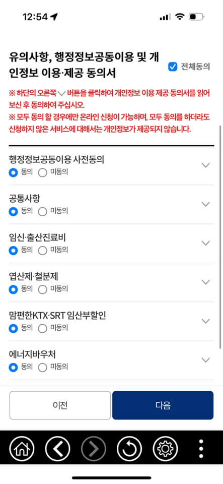 1. 맘편한 임신 통합 신청서 클릭 후 > 첫 페이지에보이는 화면에 모두 '동의' 눌러주세요.