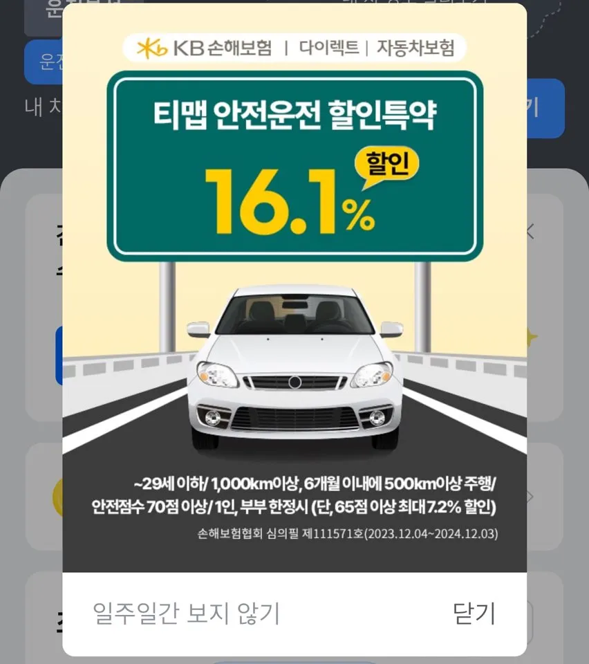 - DB손해보험: 티맵 사용 후 1,000km 이상 주행하고 61점 이상 달성 시 보험료 5~11% 할인.