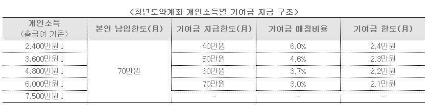 | 소득기준 | 총급여기준 6000만원 이하 : 정부 기여금지급과 비과세 적용 총급여기준 6500만원 ~ 7500만원 : 정부 기여금 없이 비과세만 적용 |