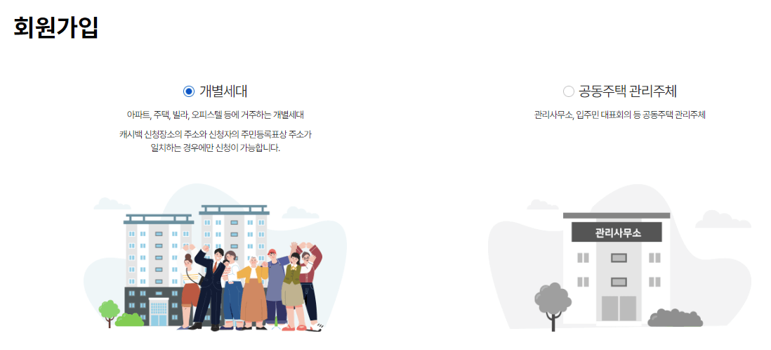 2. 개인세대인 경우 '개인세대' 선택 후 회원가입합니다. 메인 페이지에서 '에너지 효율화' 메뉴 선택하면 '에너지 캐시백' 메뉴가 보입니다.
