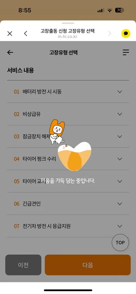 • 위 버튼을 통해 모바일 고장출동 신청하기 링크에 접속 후 해당되는 유형을 선택합니다.