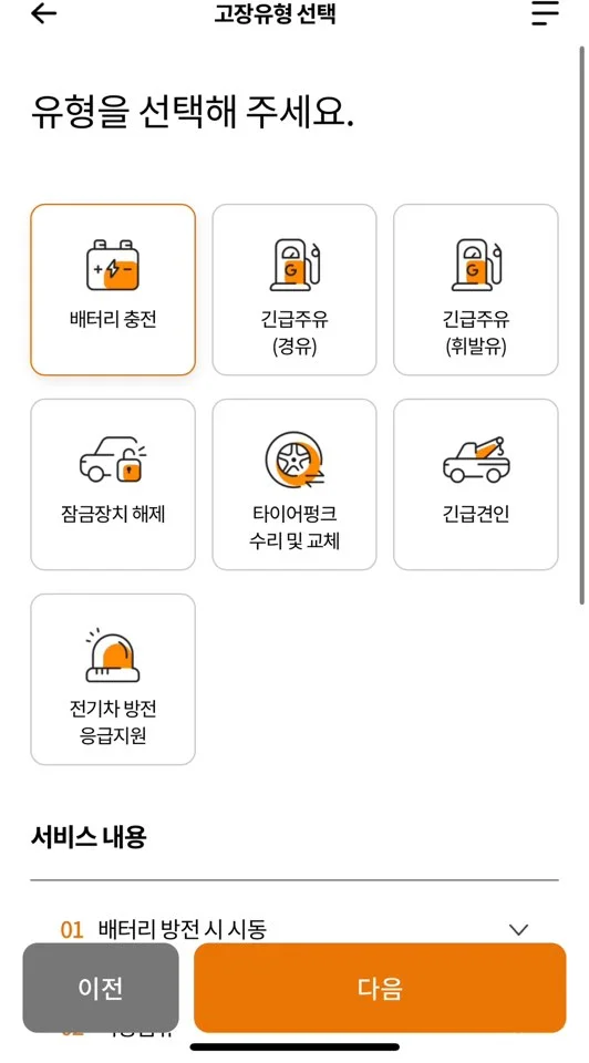 • 고장 유형은 : 배터리 충전, 긴급주유, 잠금장치 해제, 타이어 펑크 수리 및 교체, 긴급 견인, 전기차 방번이 해당됩니다.