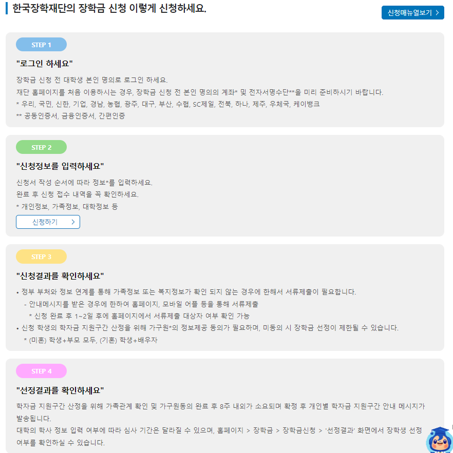 한 번도 한국장학재단에서 신청해본 적이 없다면 회원 가입 후 서비스 이용자 등록을 해야됩니다. 장학금이나 다른 제도도 신청하실 수 있습니다. 아래 이미지 참고해 주세요 :) 처음이신 분들은 아래 신청 페이지 접속 경로 봐주세요. 이미 회원가입한 분들이라면 장학금 신청 메뉴얼 다운받아서 보고 따라하실 수 있습니다. 또한 앱으로도 신청 및 서류제출 할 수 있으니 참고해 주세요!