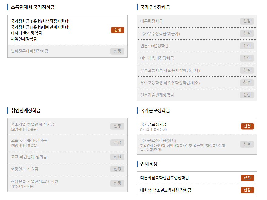 | 유형 | 국가 장학금 Ⅰ, 국가 장학금 Ⅱ . 다자녀 국가장학금. 지역인재장학금 |